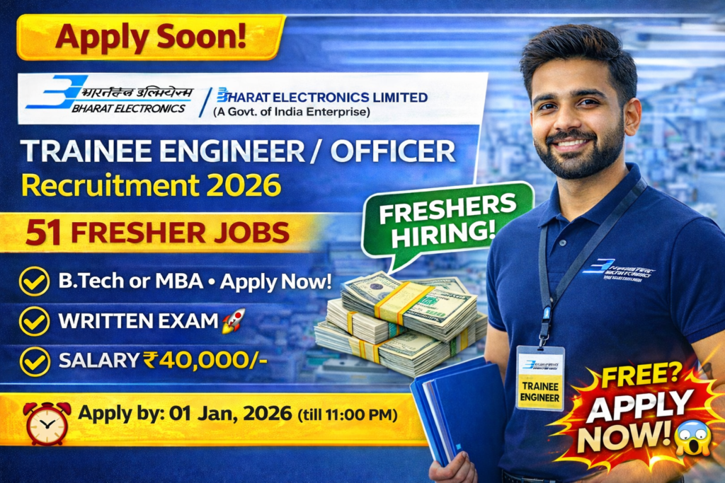 Bharat Electronics Limited (BEL), a Navratna Public Sector Undertaking under the Ministry of Defence, has released Advertisement No. 21001/HR/KOT/REC/2025-26/04 dated 01 January 2026 for engagement of Trainee Engineer-I and Trainee Officer-I on a temporary basis for its Kotdwara Unit and various project locations across India. This recruitment drive is aimed at hiring young engineering and finance graduates for BEL’s defence and strategic electronics projects. The selection will be carried out through a written test followed by document verification, and selected candidates will receive a monthly consolidated remuneration up to Rs. 40,000/-, along with additional allowances. The online pre-registration window is open from 01 January 2026 to 15 January 2026.