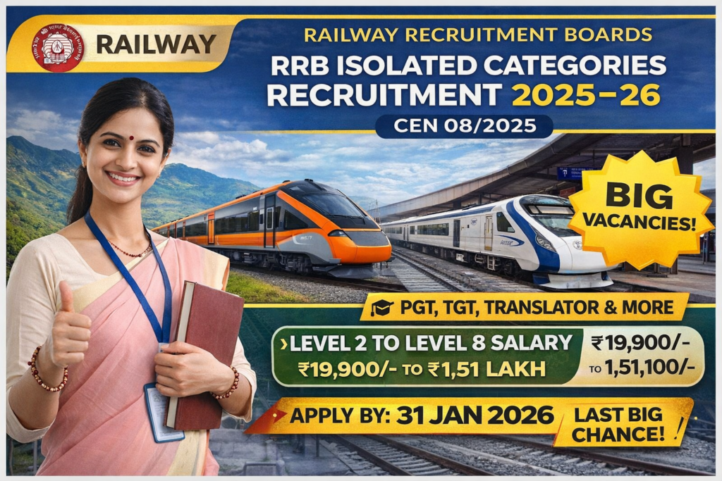 Railway Recruitment Boards (RRBs), under the Ministry of Railways, Government of India, have released Centralised Employment Notice (CEN) No. 08/2025 for recruitment to Isolated Categories posts across various Zonal Railways and Production Units of Indian Railways. This recruitment drive is being conducted to fill vacancies in specialised categories such as Post Graduate Teachers (PGT), Trained Graduate Teachers (TGT), Junior Translator (Hindi), Scientific Supervisor, Chief Law Assistant, Cook, Lab Assistant and other isolated posts. The posts are regular and permanent in nature, carrying pay scales as per the 7th Central Pay Commission. The online application process will commence on 02 January 2026 and close on 31 January 2026.