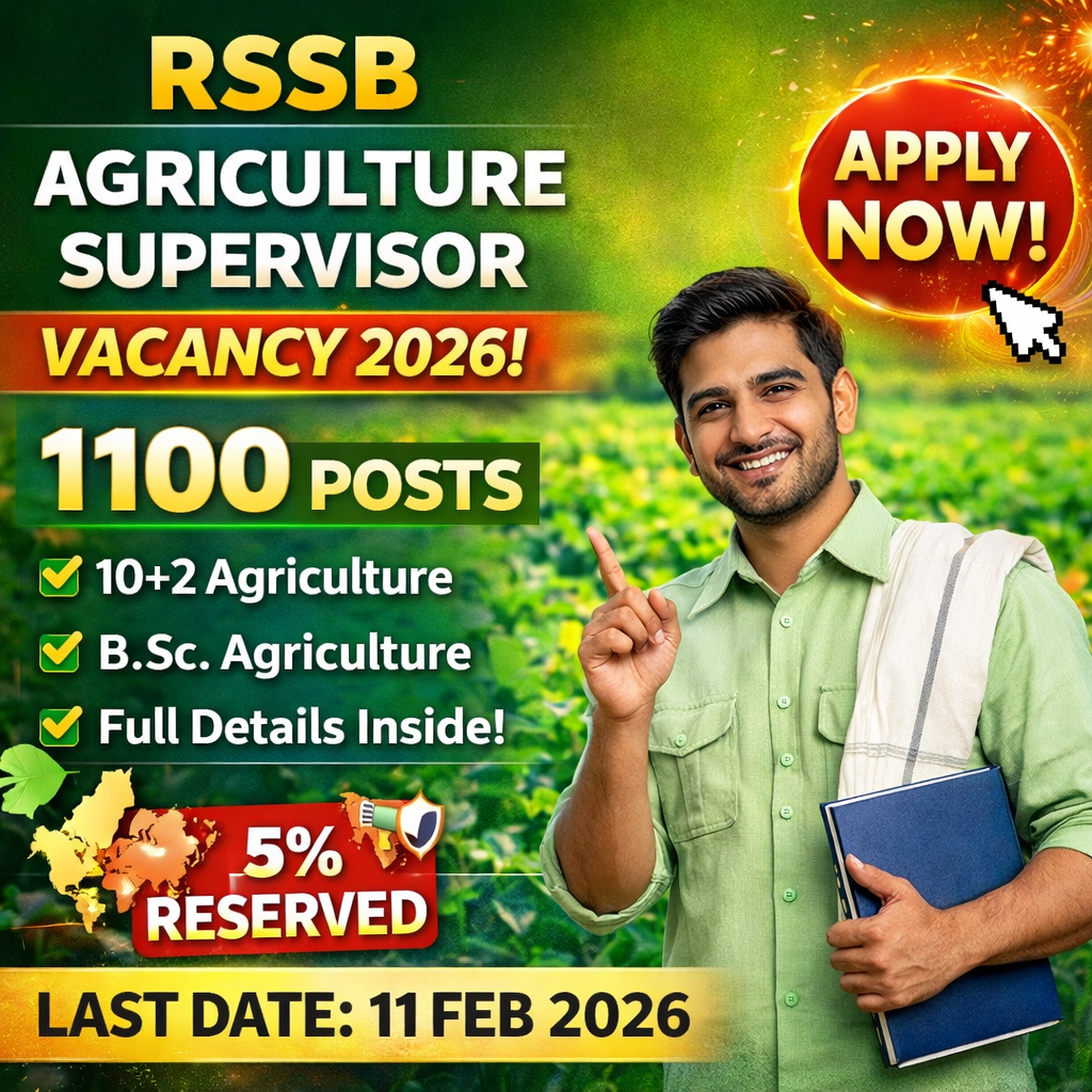 The Rajasthan Staff Selection Board (RSSB), Jaipur has officially released Advertisement No. 03/2026 for direct recruitment of Agriculture Supervisors (कृषि पर्यवेक्षक / Krishi Paryavekshak) under the Department of Agriculture, Government of Rajasthan. This recruitment is being conducted in accordance with the Rajasthan Agriculture Subordinate Service Rules, 1978 (as amended) and the Rajasthan Scheduled Area Subordinate, Ministerial & Class-IV Service (Recruitment & Other Service Conditions) Rules, 2014. A total of 1100 posts have been notified, including 944 posts for Non-Scheduled Area and 156 posts for Scheduled Area. Applications are invited only through online mode via the Rajasthan SSO portal using the One Time Registration (OTR) system. This is a permanent state government Group-C post, offering stable service, structured pay under the 7th Pay Commission, and postings across Rajasthan.